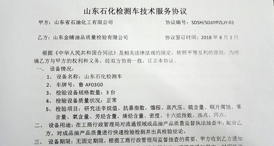 8月1日,山東石化與濟寧金睛油品質量檢測有限公司簽署技術服務協(xié)議,山東石化移動油品檢測車從此開始肩負起外部加油站油品檢測的重任。