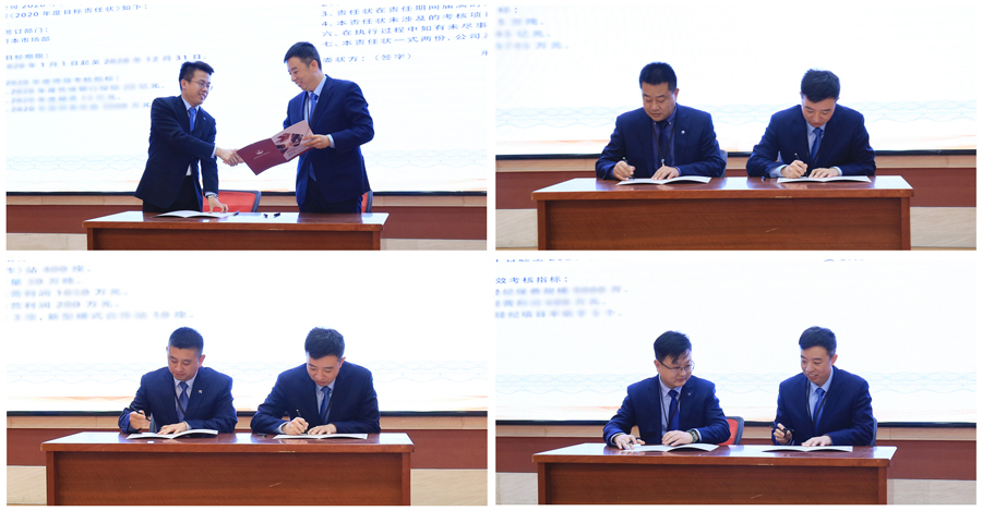 為了確保完成全年工作目標(biāo),統(tǒng)一思想認(rèn)識(shí),理清工作思路,明確責(zé)任目標(biāo),財(cái)務(wù)風(fēng)控部總監(jiān)李作江、能化產(chǎn)品經(jīng)營(yíng)部負(fù)責(zé)人李建強(qiáng)、加盟合作事業(yè)部總經(jīng)理趙振峰、融泰保險(xiǎn)經(jīng)紀(jì)總經(jīng)理劉龍分別與山東石化董事長(zhǎng)兼總經(jīng)理祝偉簽訂2020年責(zé)任狀。